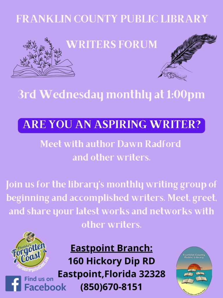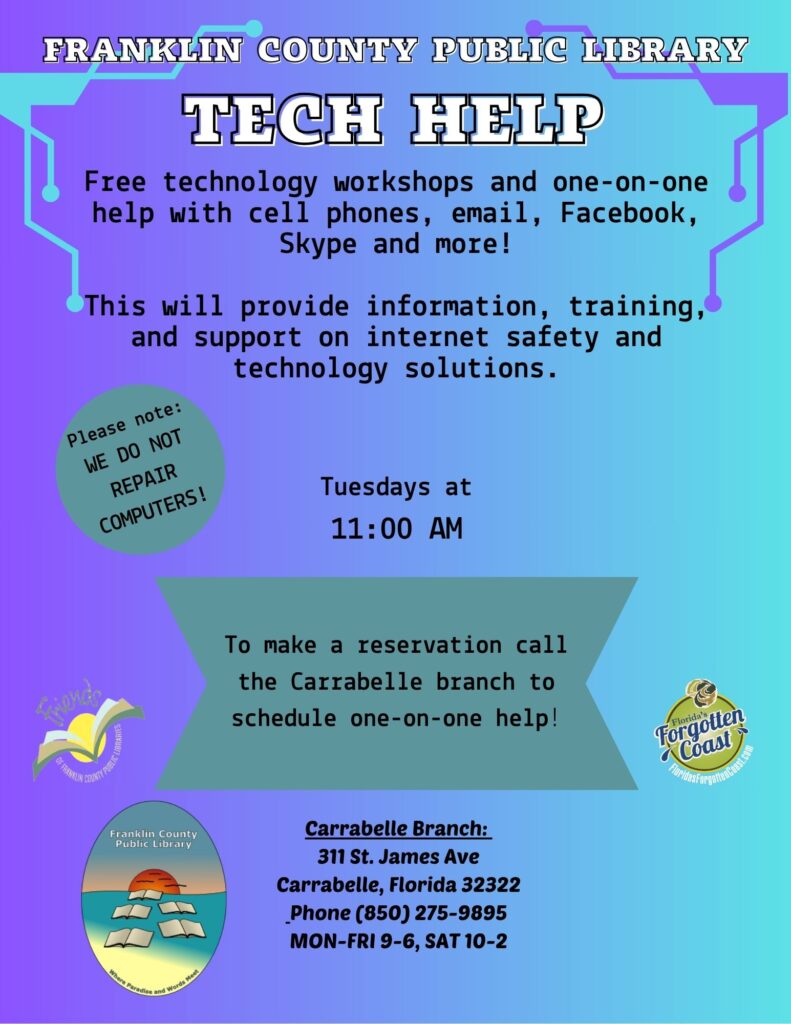 These programs are supported by the Friends of the Franklin County Public Libraries, a 501(c)(3) organization that supports the Eastpoint and Carrabelle branches. For more information or to join the Friends, please visit friendsfcpl.com or contact the Carrabelle Branch at 311 St. James Ave SE (Hwy 98), 850-275-9895, or the Eastpoint Branch at 160 Hickory Dip Rd, 850-670-8151. Programs are funded in part by the Franklin County Tourist Development Council.