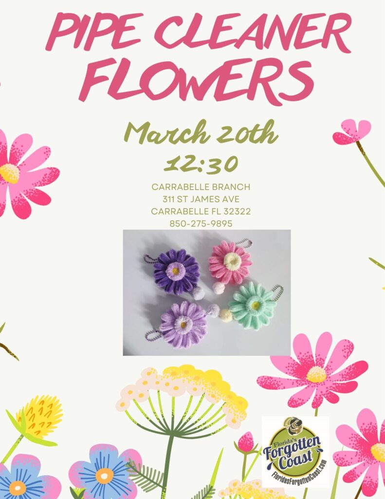A Pipe Cleaner Flowers craft workshop will take place on Friday, March 20 at 12:30 PM at the Carrabelle Branch. At this workshop, guests will create pipe cleaner flowers, a fun and easy craft that allows for endless creativity! This easy hands-on program will be provided in a fun, welcoming setting.