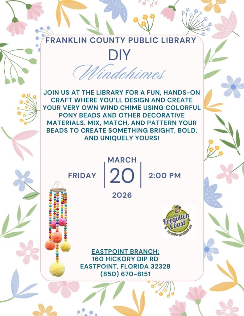DIY Windchimes, a hands-on craft program where patrons can design and create their very own wind chime using colorful pony beads and other decorative materials. Guests can mix, match, and pattern beads to create something bright, bold, and unique. The program will be offered on Friday, March 20 at 2:00 PM at the Eastpoint Branch.