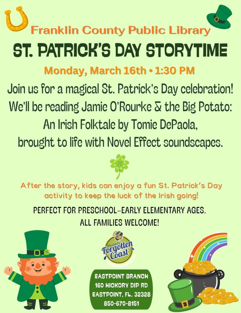 St. Patrick’s Day Storytime will be held on Monday, March 16 at 1:30 PM at the Eastpoint Branch. At this magical St. Patrick’s Day celebration, kids will enjoy a storytime featuring Jamie O’Rourke & the Big Potato: An Irish Folktale by Tomie DePaola, which will be brought to life with Novel Effect soundscapes. After the story, children can enjoy a fun St. Patrick’s Day activity to keep the luck of the Irish going! This session is perfect for preschool & early elementary ages and all families are welcome.