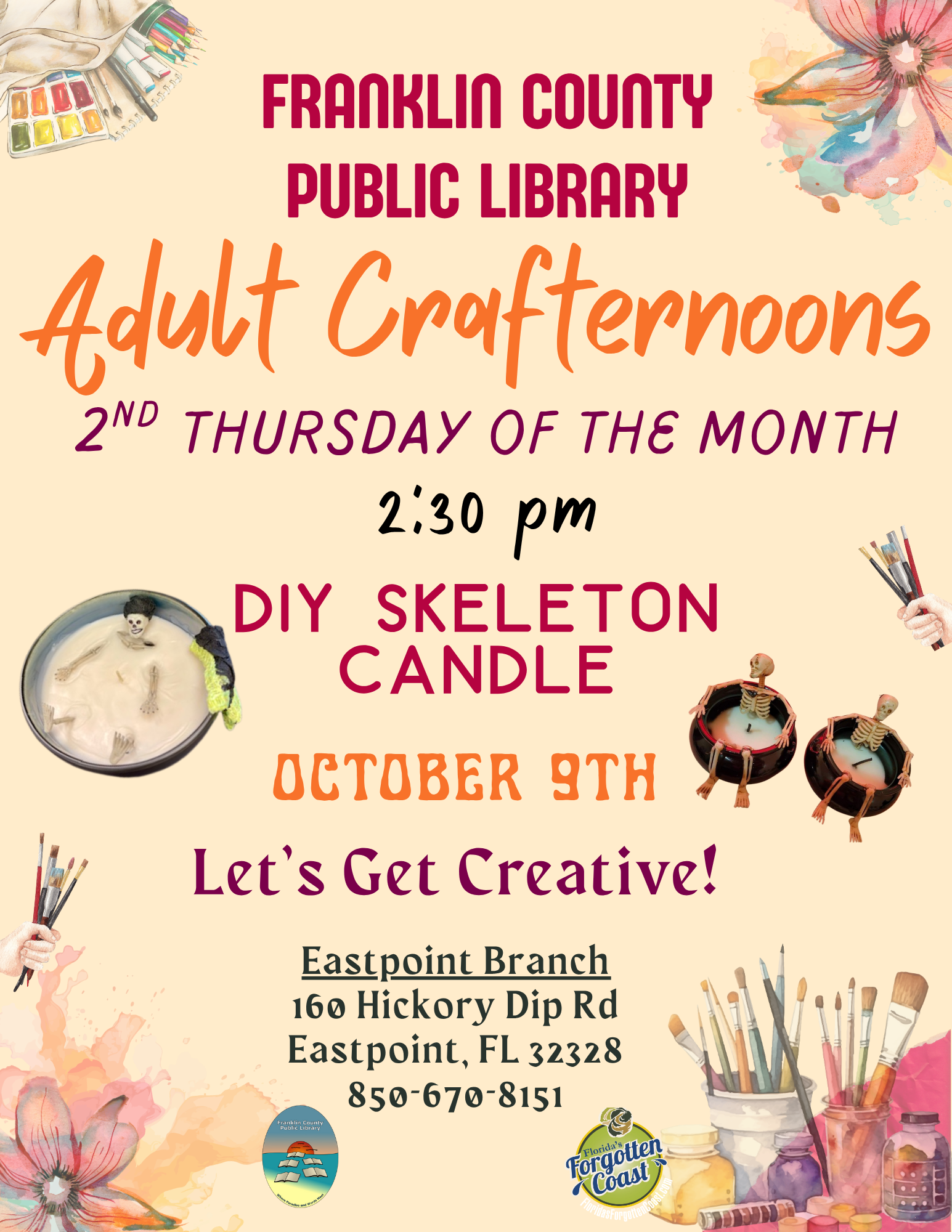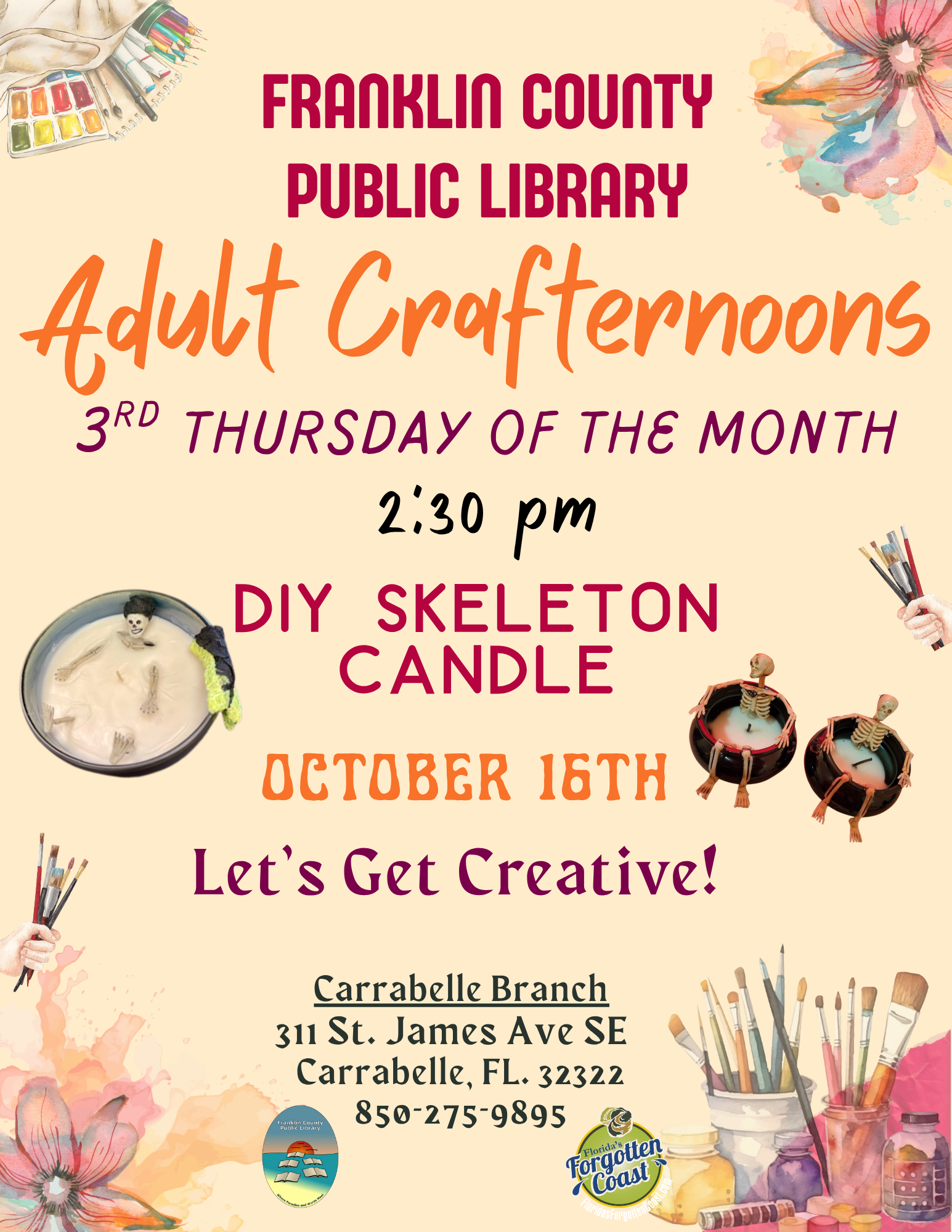 – a creative Halloween-themed craft event as part of their Fall Program Series - Adult Crafternoon: DIY Skeleton Candle. This hands-on crafting workshop will take place on Thursday, October 16, 2025 at 2:30 PM at the Carrabelle Branch Library, located at 311 St. James Avenue (Hwy 98), Carrabelle, FL. The workshop is free with all […]