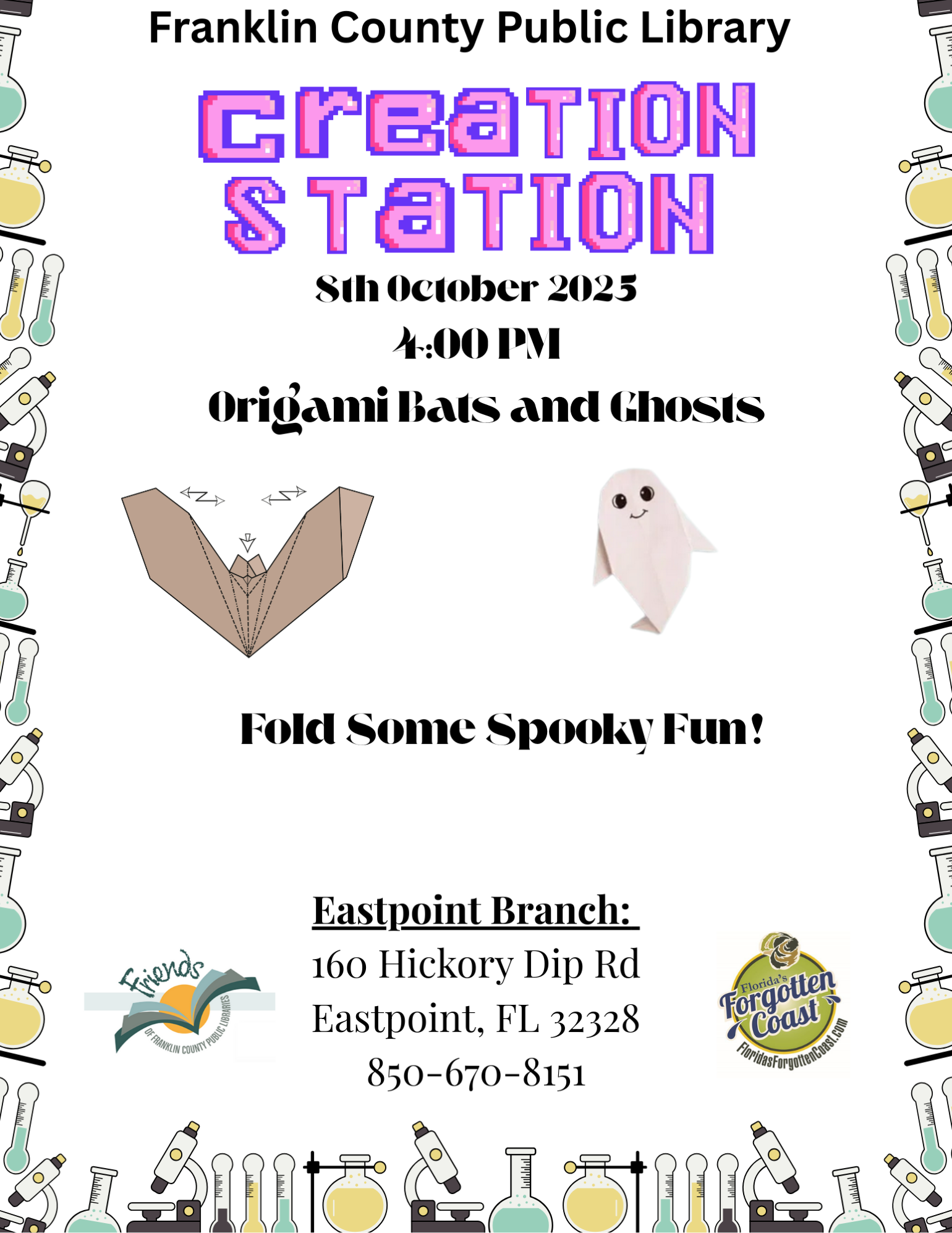 The Friends of the Franklin County Public Libraries (FFCPL) are pleased to announce another exciting event in their Fall Program Series - Creation Station:Origami Bats and Ghosts. Participants will fold spooky origami bats and ghosts, sparking creativity while enjoying hands-on Halloween fun. This interactive workshop will take place at the Eastpoint Branch Library, located at […]