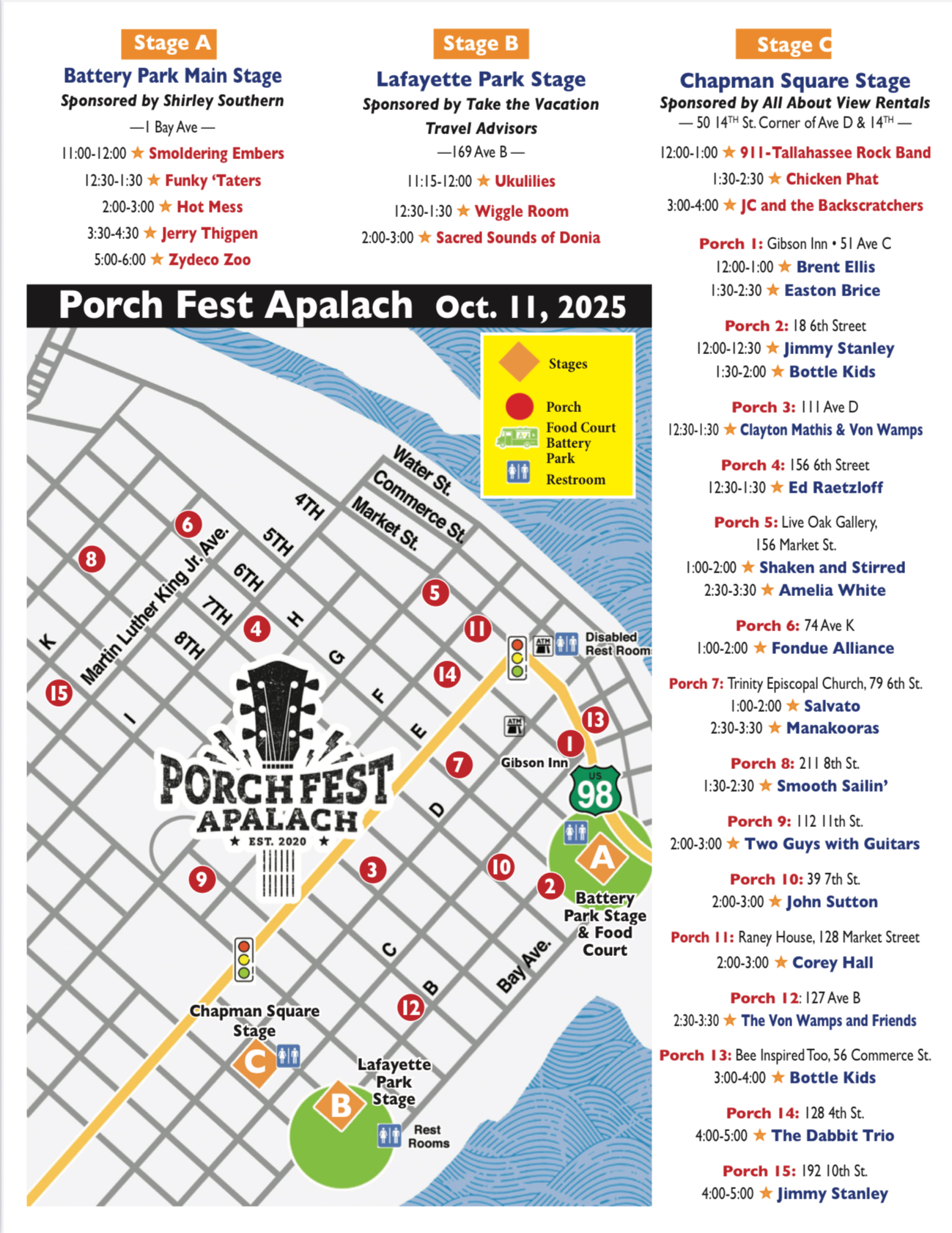 Apalachicola’s grassroots community music festival, where front porches become stages, yards become venues and generosity rules the day. Porch Fest Apalach, a free event, is held annually in Downtown Apalachicola. It’s a small, volunteer-run festival where front porches become stages, yards become venues, and good will rules the day. We begin and end at Battery […]