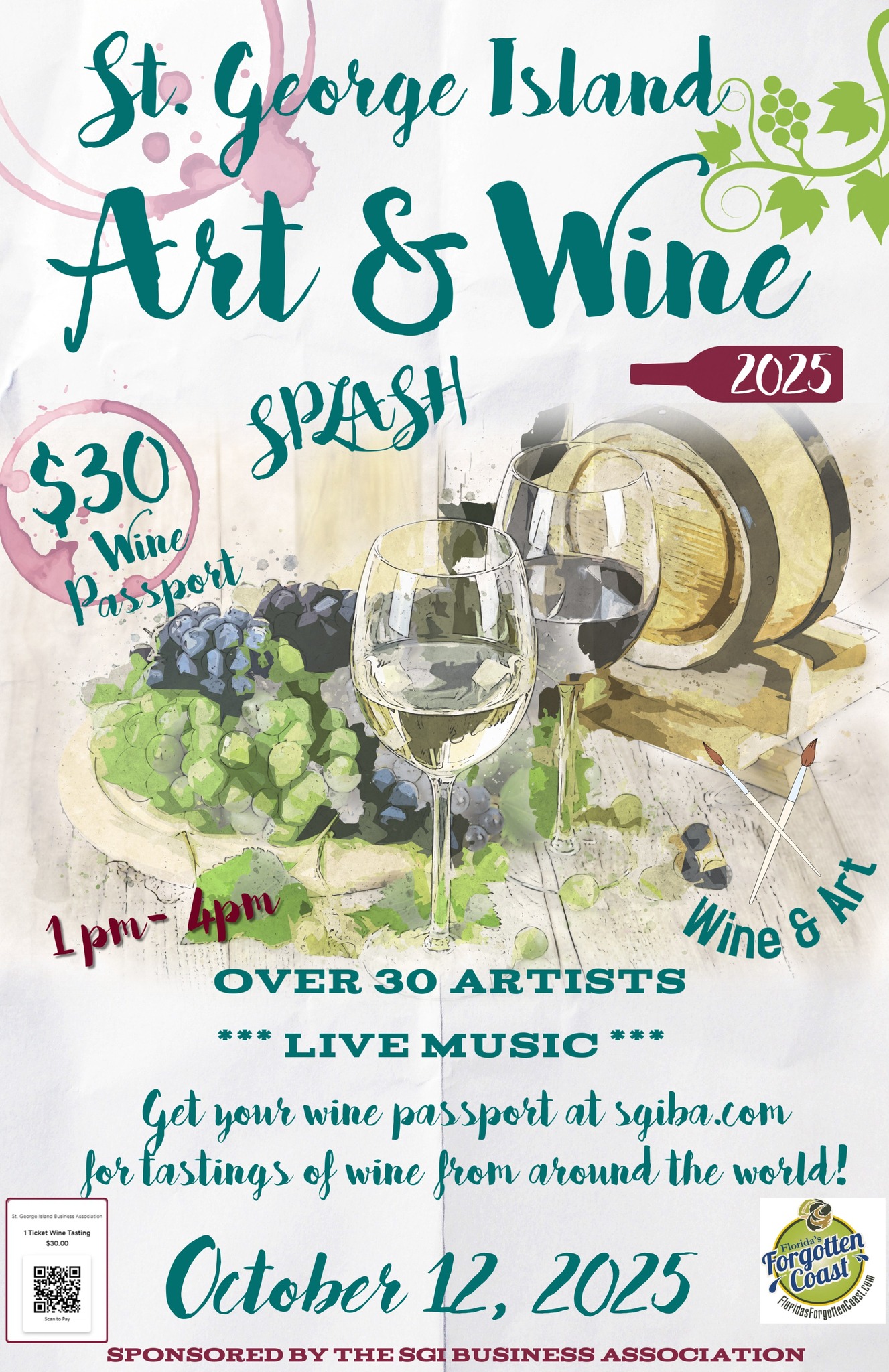St. George Island will host its Annual Art and Wine Splash on Sunday, October 12. The event will feature artists and craftsmen offering original and unique items. The event offers a Wine Walk which will take place from Noon-5 p.m with wine pour and art stations and musical entertainment.